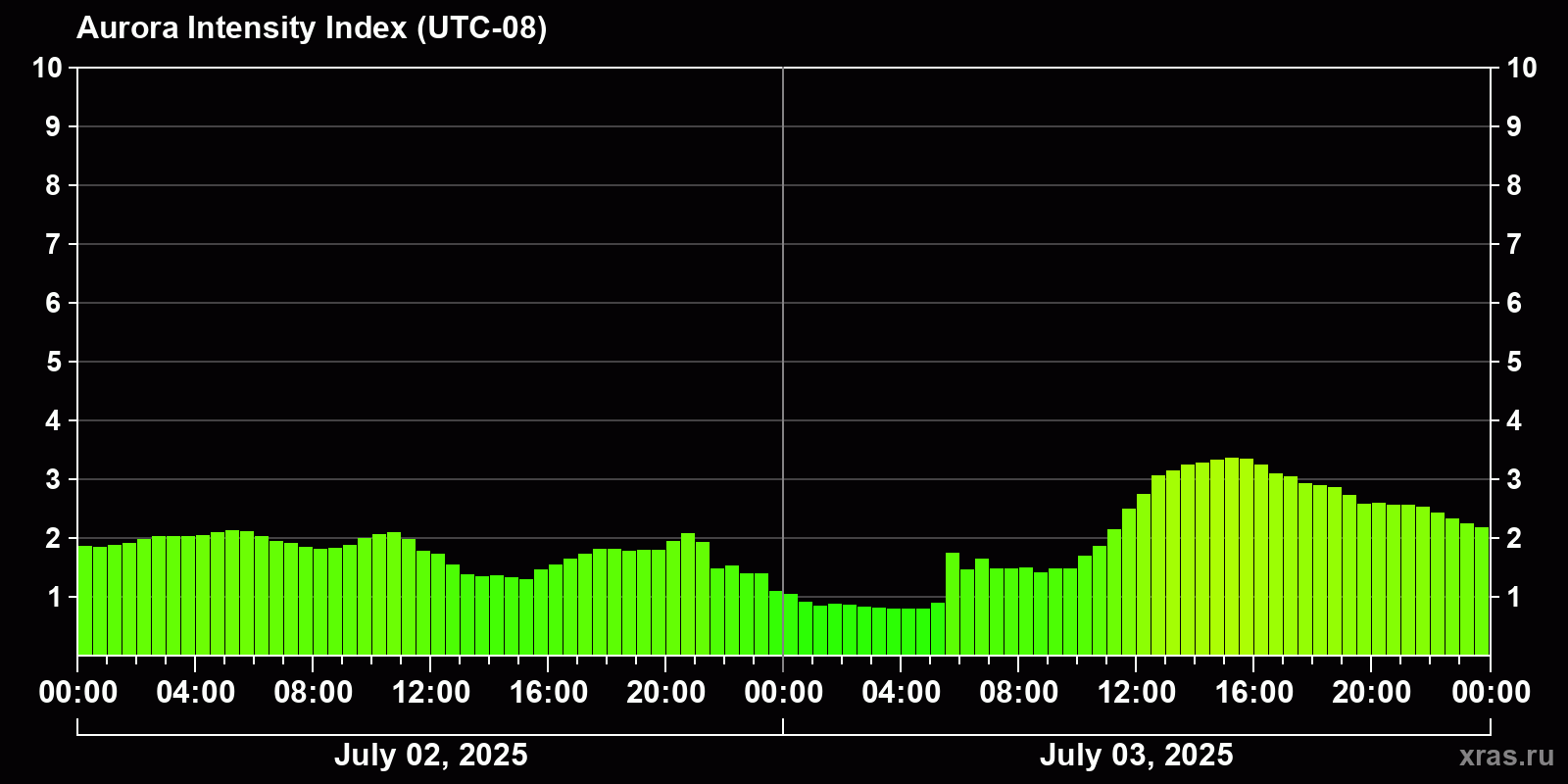 Changes in the auroral intensity index from 2025-07-02 to 2025-07-03 local time