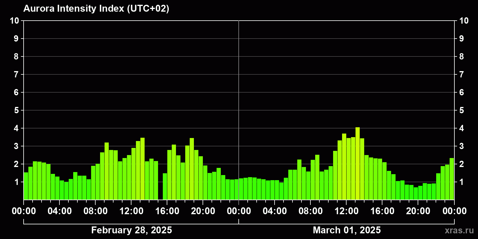Auroral intensity index and the theoretically possible latitude of observations for nighttime in the Estern Hemisphere as of 2025-03-01 23:48 (end of day) local time