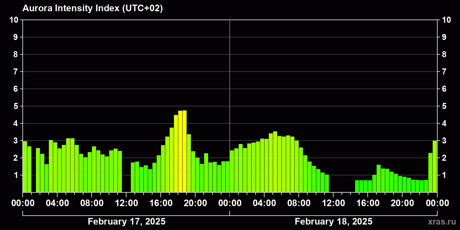 Auroral intensity index and the theoretically possible latitude of observations for nighttime in the Estern Hemisphere as of 2025-02-18 23:54 (end of day) local time