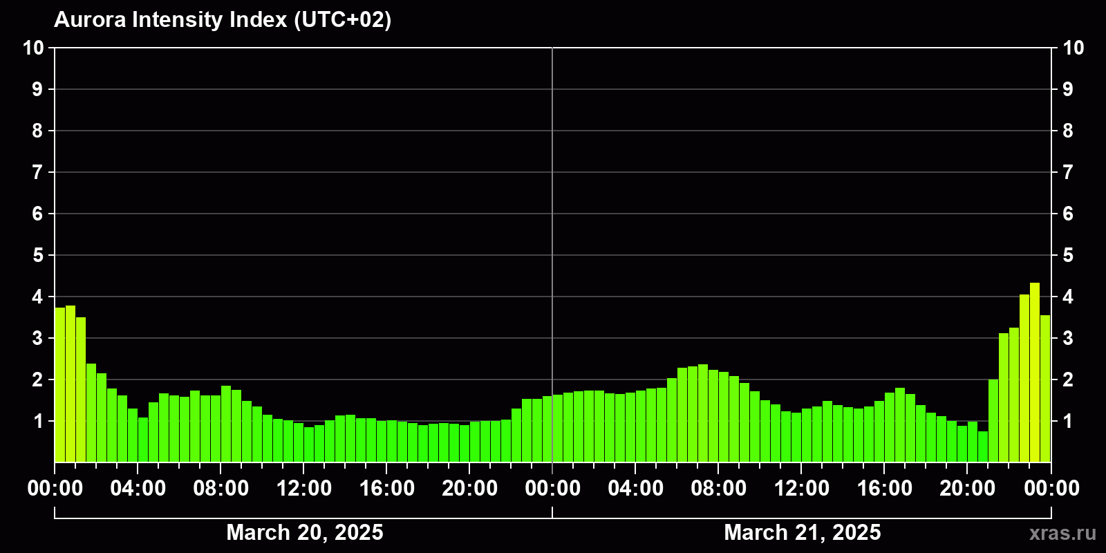 Auroral intensity index and the theoretically possible latitude of observations for nighttime in the Estern Hemisphere as of 2025-03-21 23:46 (end of day) local time