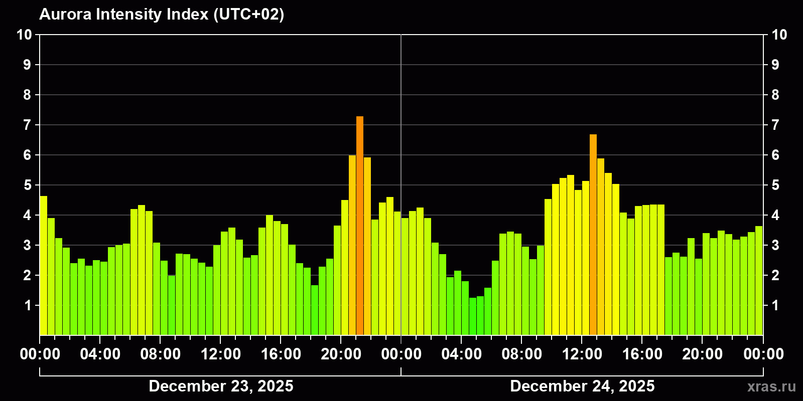 Auroral intensity index and the theoretically possible latitude of observations for nighttime in the Estern Hemisphere as of 2025-12-24 23:50 (end of day) local time