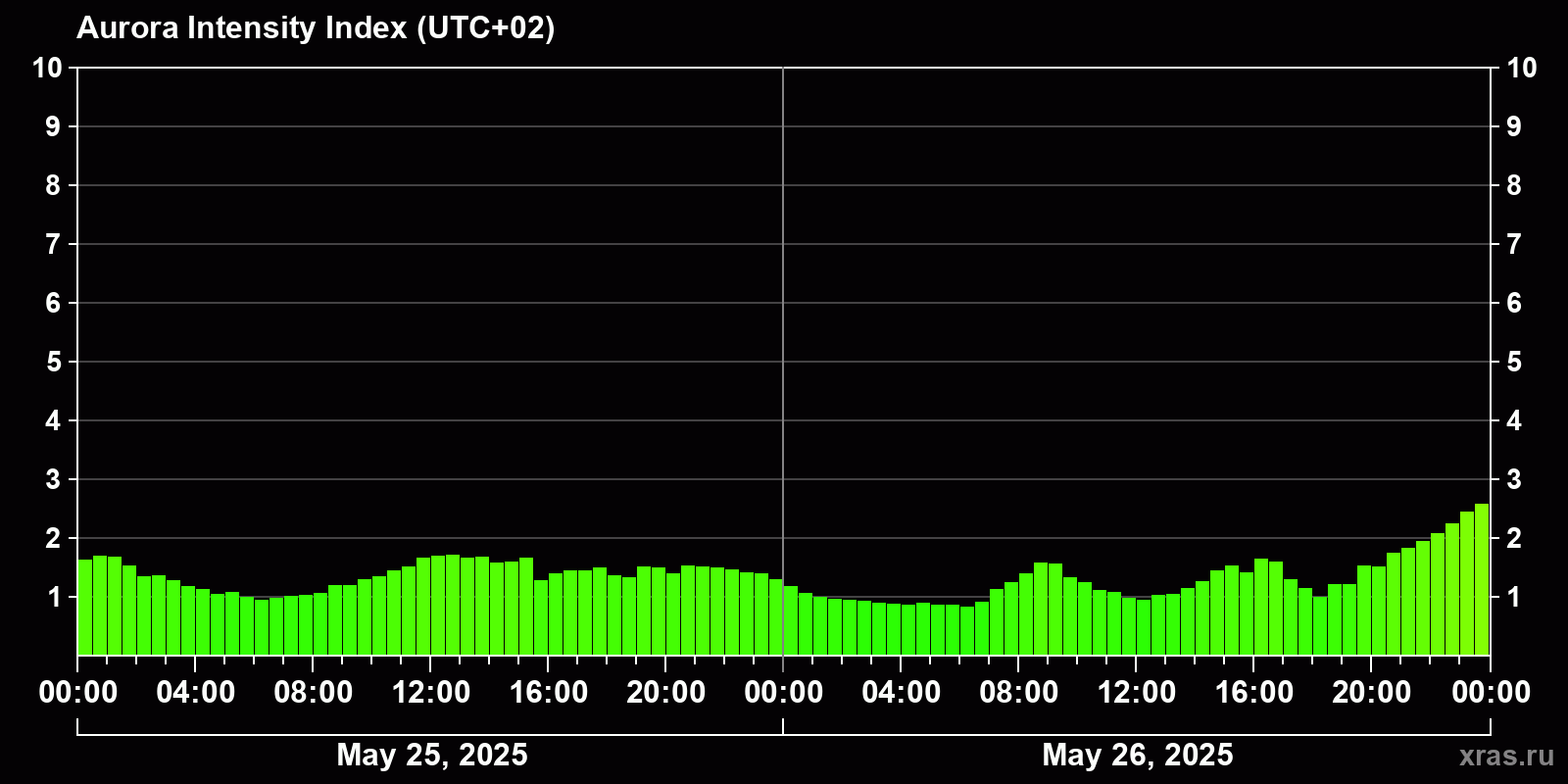 Changes in the auroral intensity index from 2025-05-25 to 2025-05-26 local time