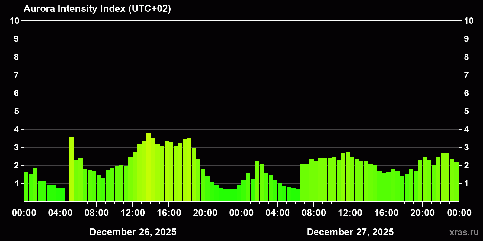 Changes in the auroral intensity index from 2025-12-26 to 2025-12-27 local time