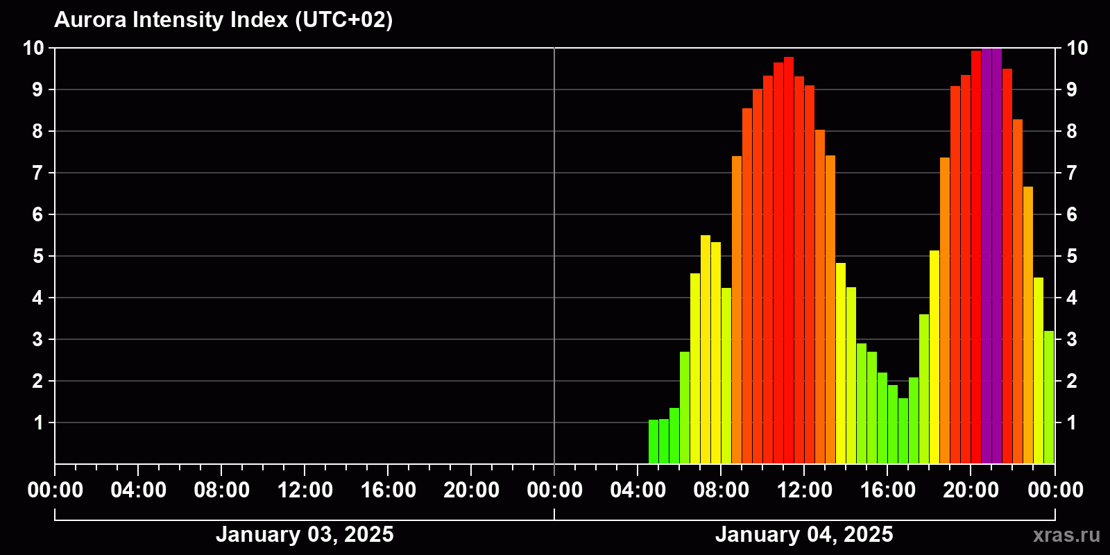 Auroral intensity index and the theoretically possible latitude of observations for nighttime in the Estern Hemisphere as of 2025-01-04 23:52 (end of day) local time