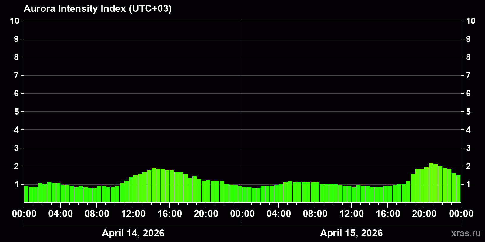Changes in the auroral intensity index from 2026-04-14 to 2026-04-15 local time