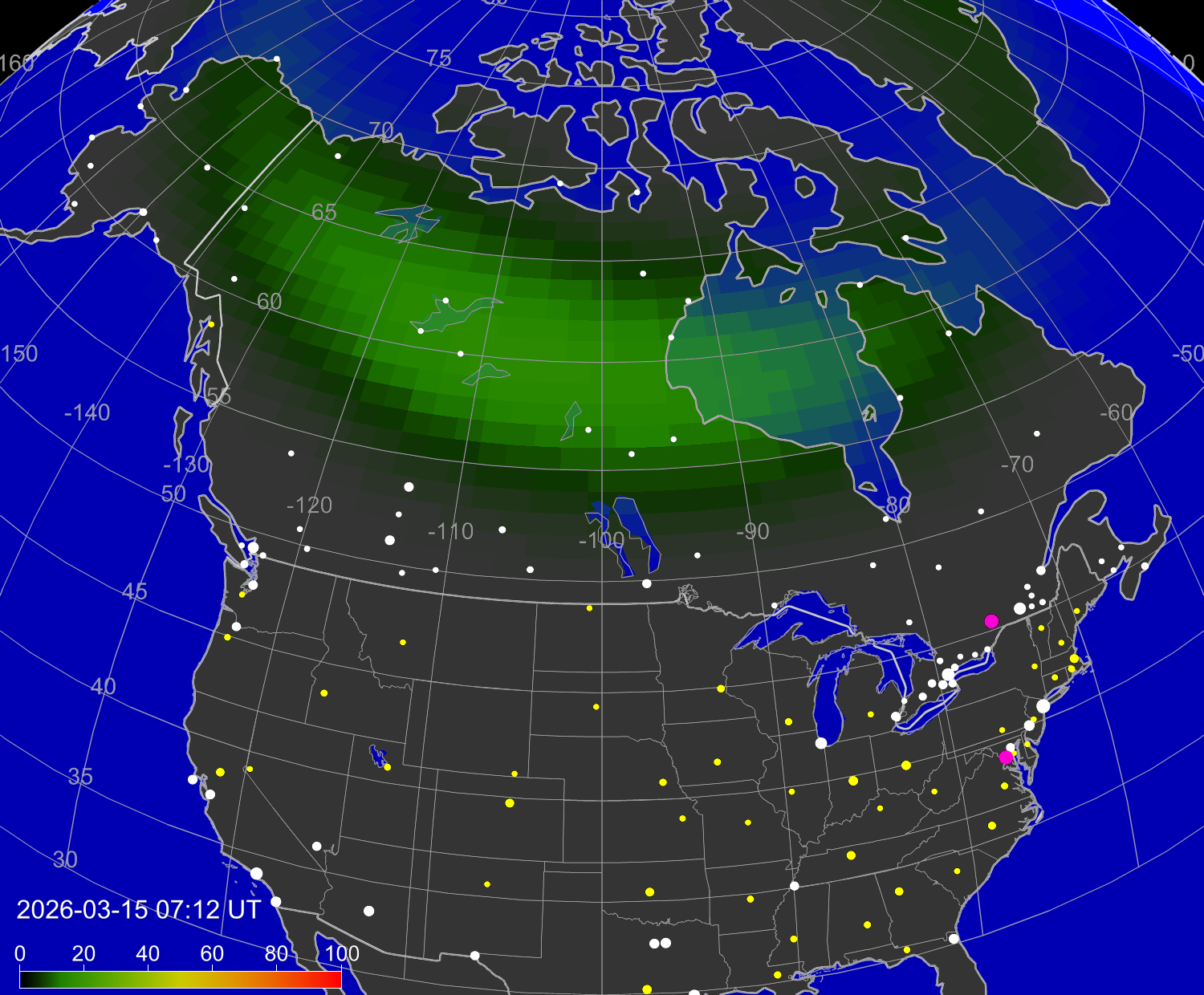 Индекс интенсивности полярных сияний и теоретически возможная широта наблюдений для ночного времени в западном полушарии
