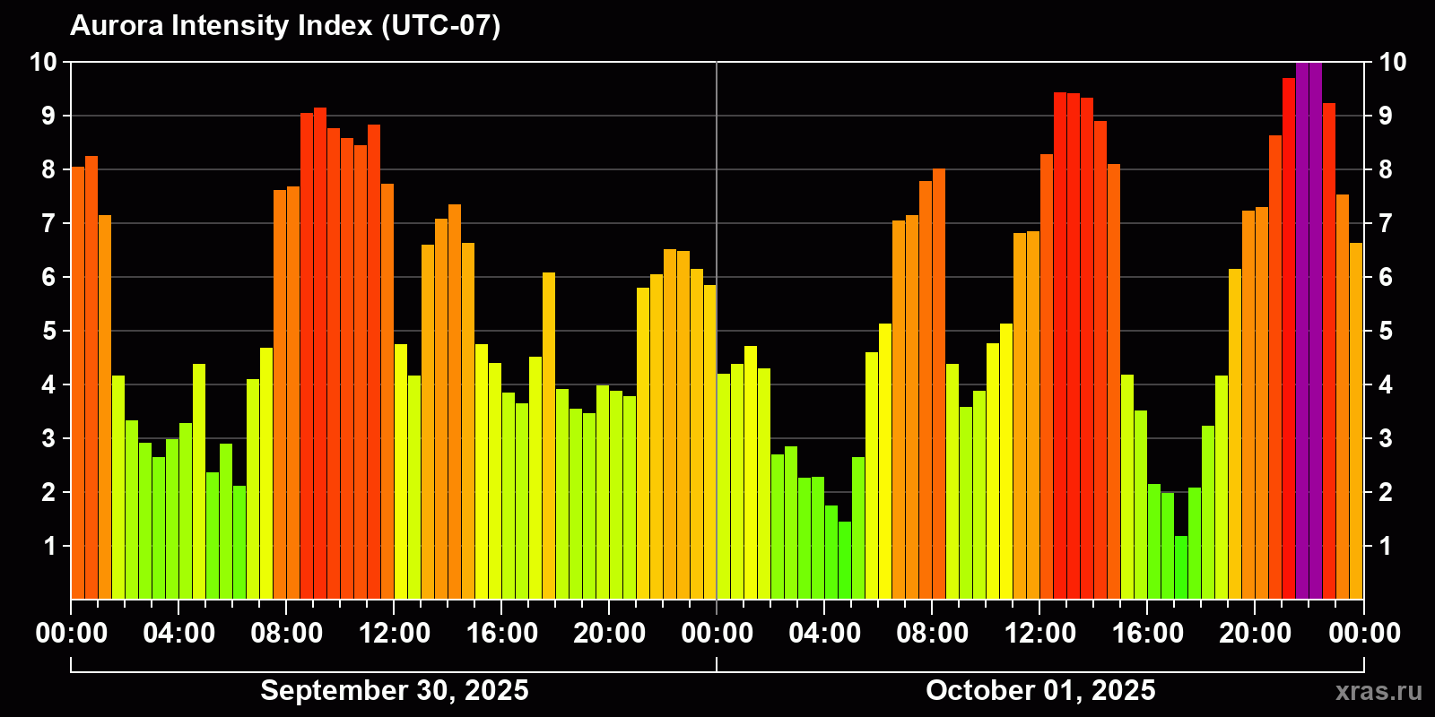 Changes in the auroral intensity index from 2025-09-30 to 2025-10-01 local time