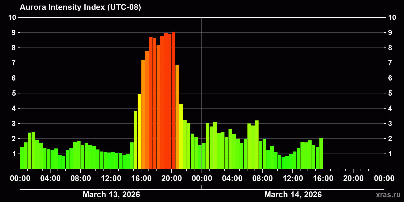 Changes in the auroral intensity index from 2026-03-13 to 2026-03-14 local time