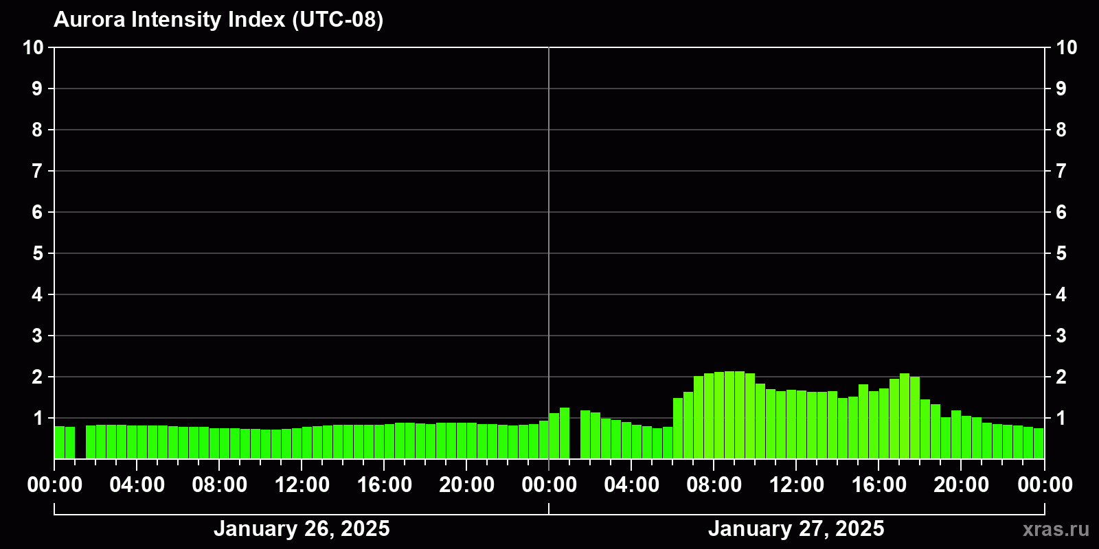 Changes in the auroral intensity index from 2025-01-26 to 2025-01-27 local time