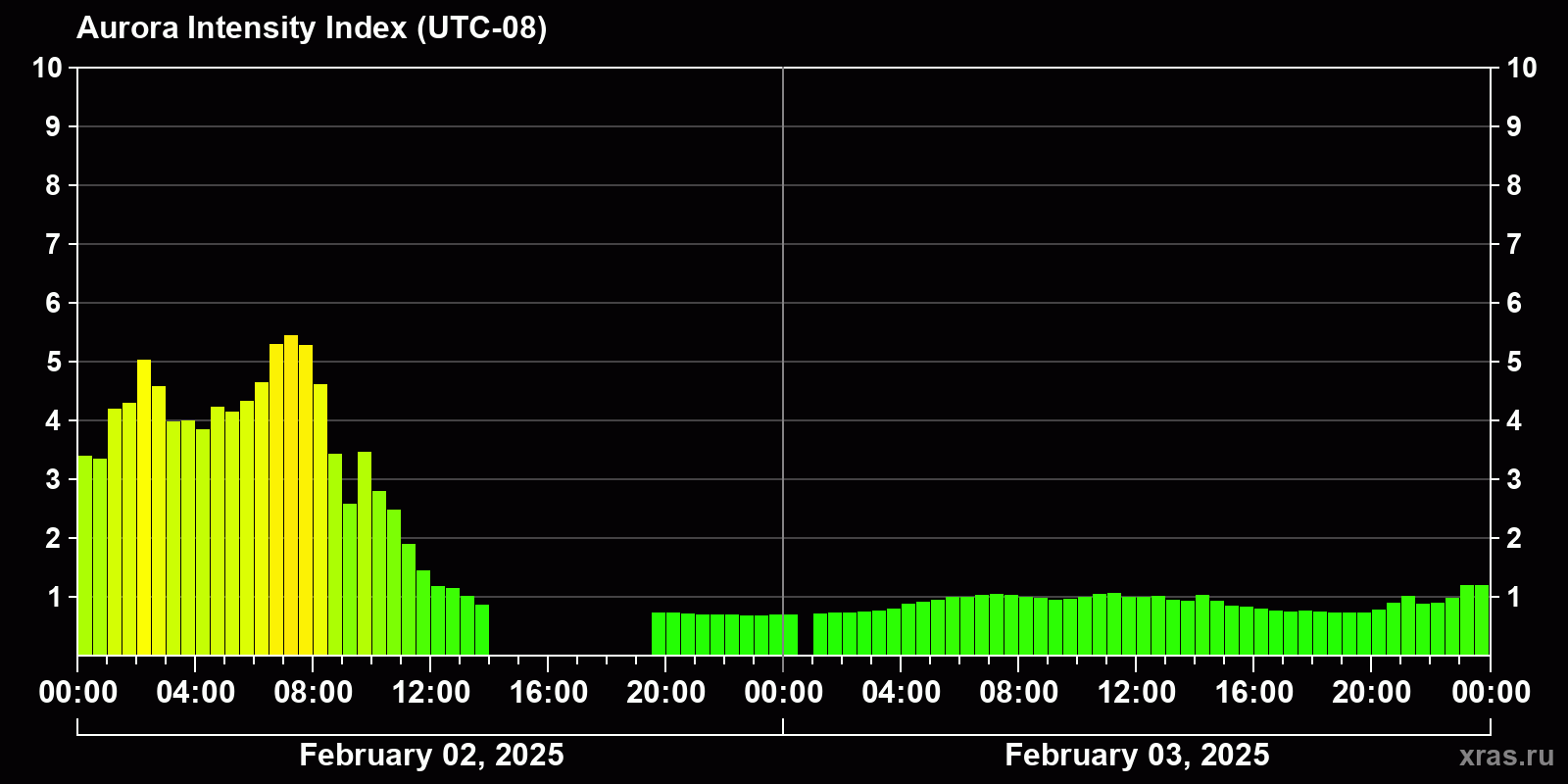 Changes in the auroral intensity index from 2025-02-02 to 2025-02-03 local time