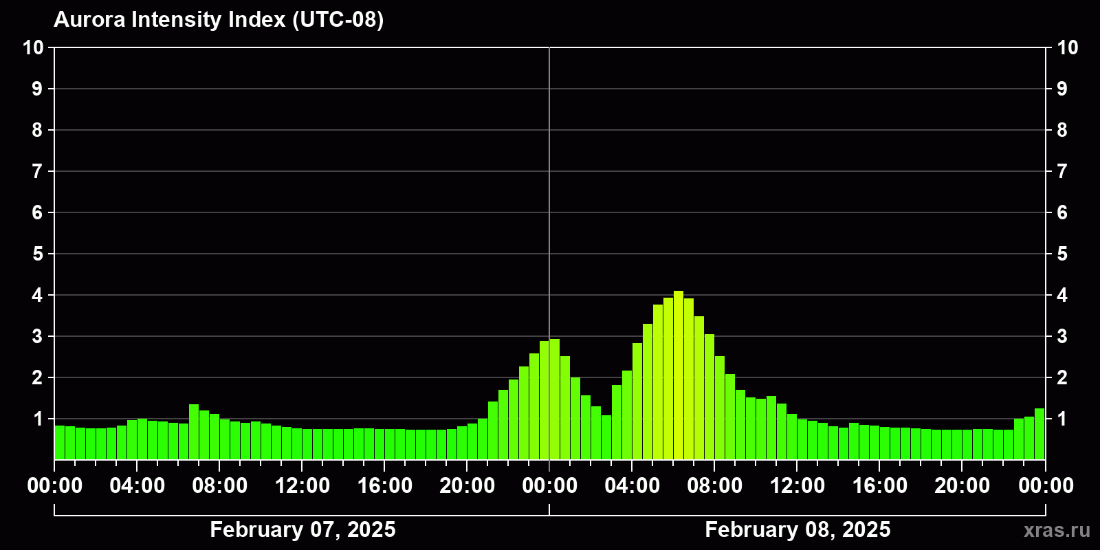 Changes in the auroral intensity index from 2025-02-07 to 2025-02-08 local time