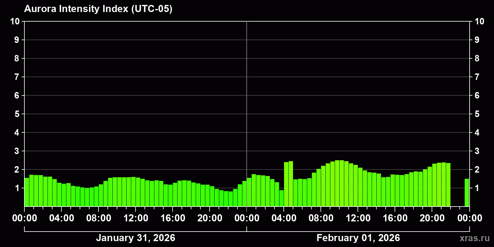 Auroral intensity index and the theoretically possible latitude of observations for nighttime in the Western Hemisphere as of 2026-02-01 23:58 (end of day) local time