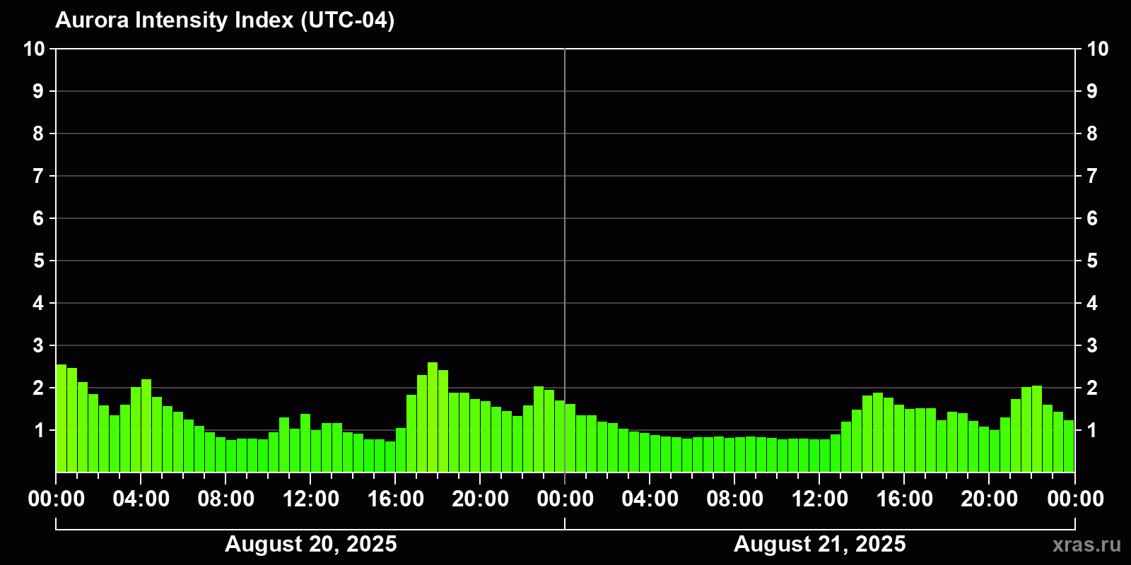 Auroral intensity index and the theoretically possible latitude of observations for nighttime in the Western Hemisphere as of 2025-08-21 23:58 (end of day) local time