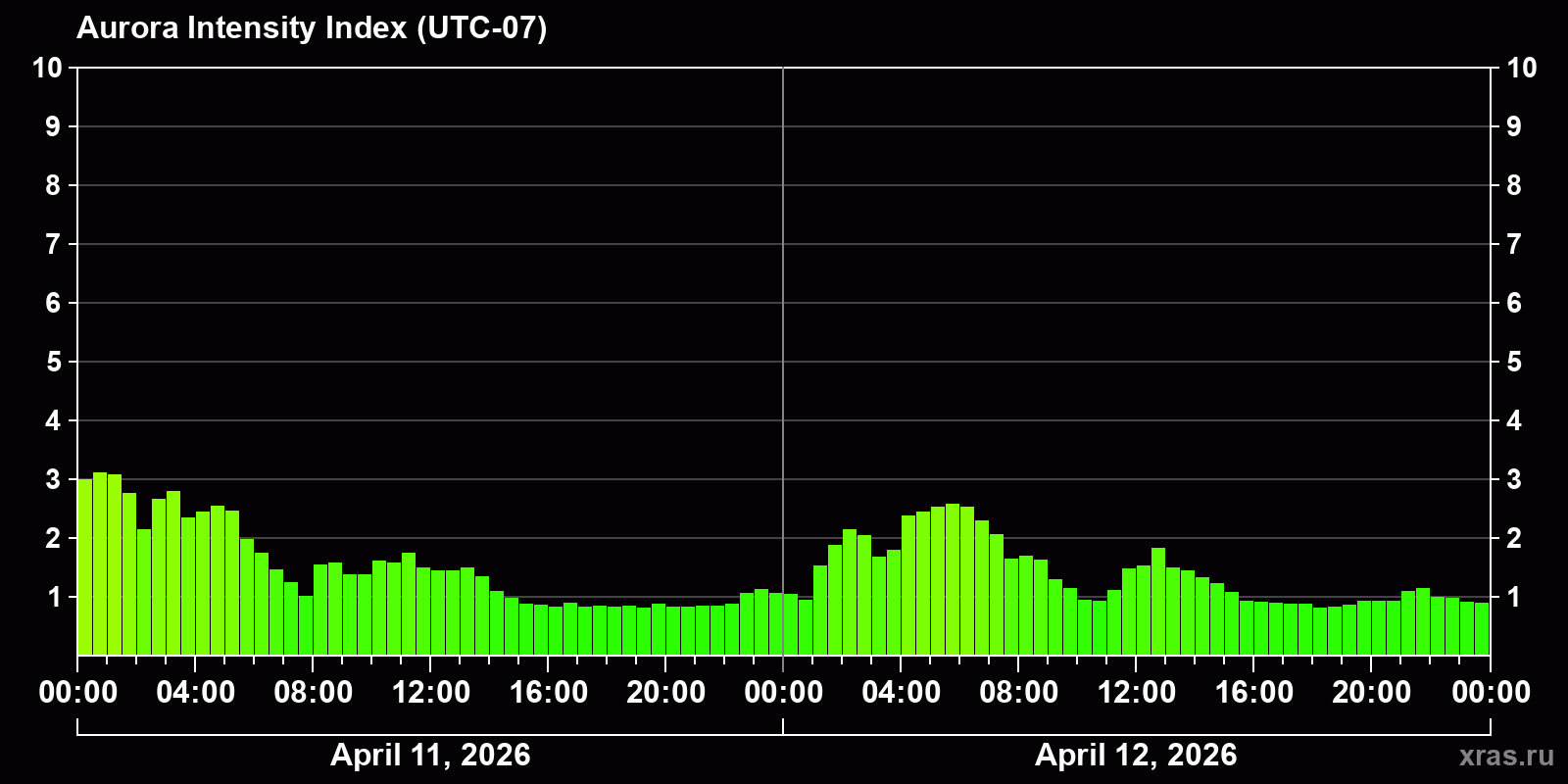 Changes in the auroral intensity index from 2026-04-11 to 2026-04-12 local time