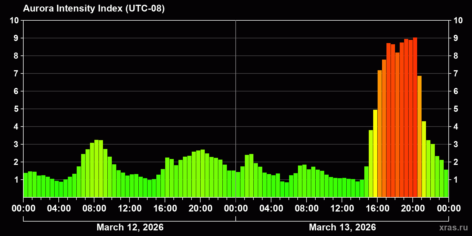 Changes in the auroral intensity index from 2026-03-12 to 2026-03-13 local time