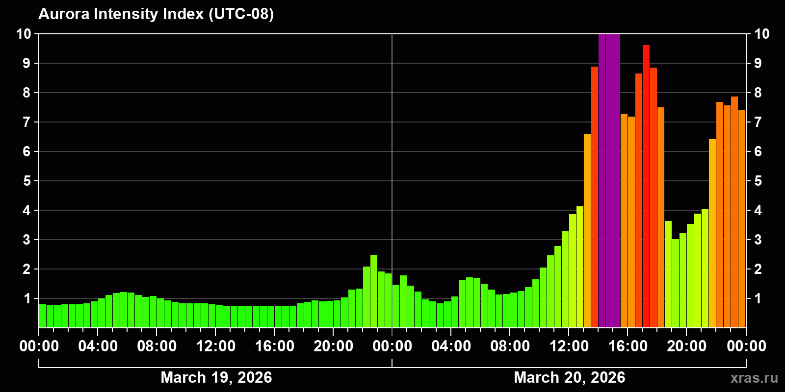 Changes in the auroral intensity index from 2026-03-19 to 2026-03-20 local time