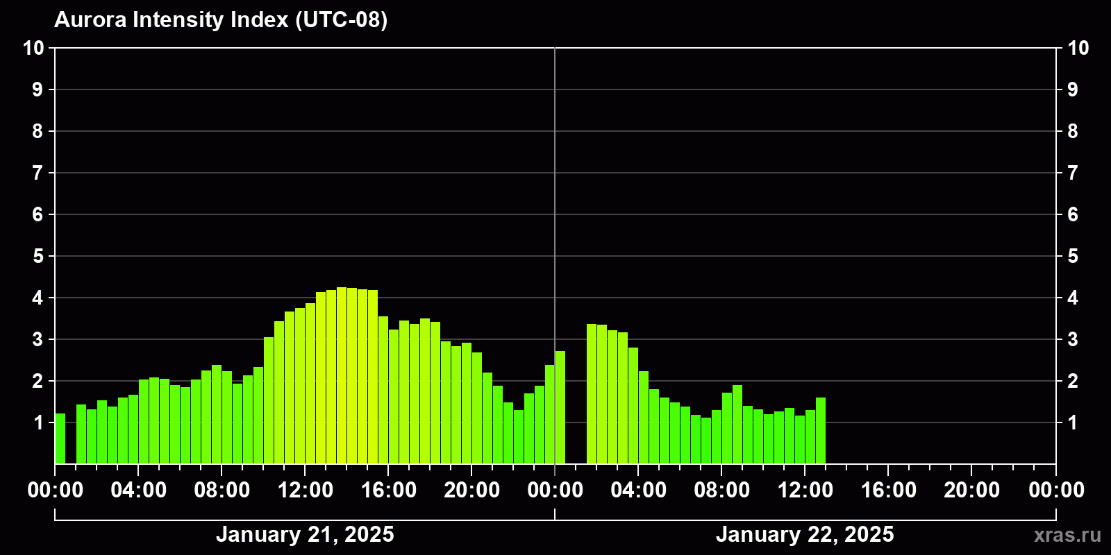 Auroral intensity index and the theoretically possible latitude of observations for nighttime in the Western Hemisphere as of 2025-01-22 12:44 (end of day) local time