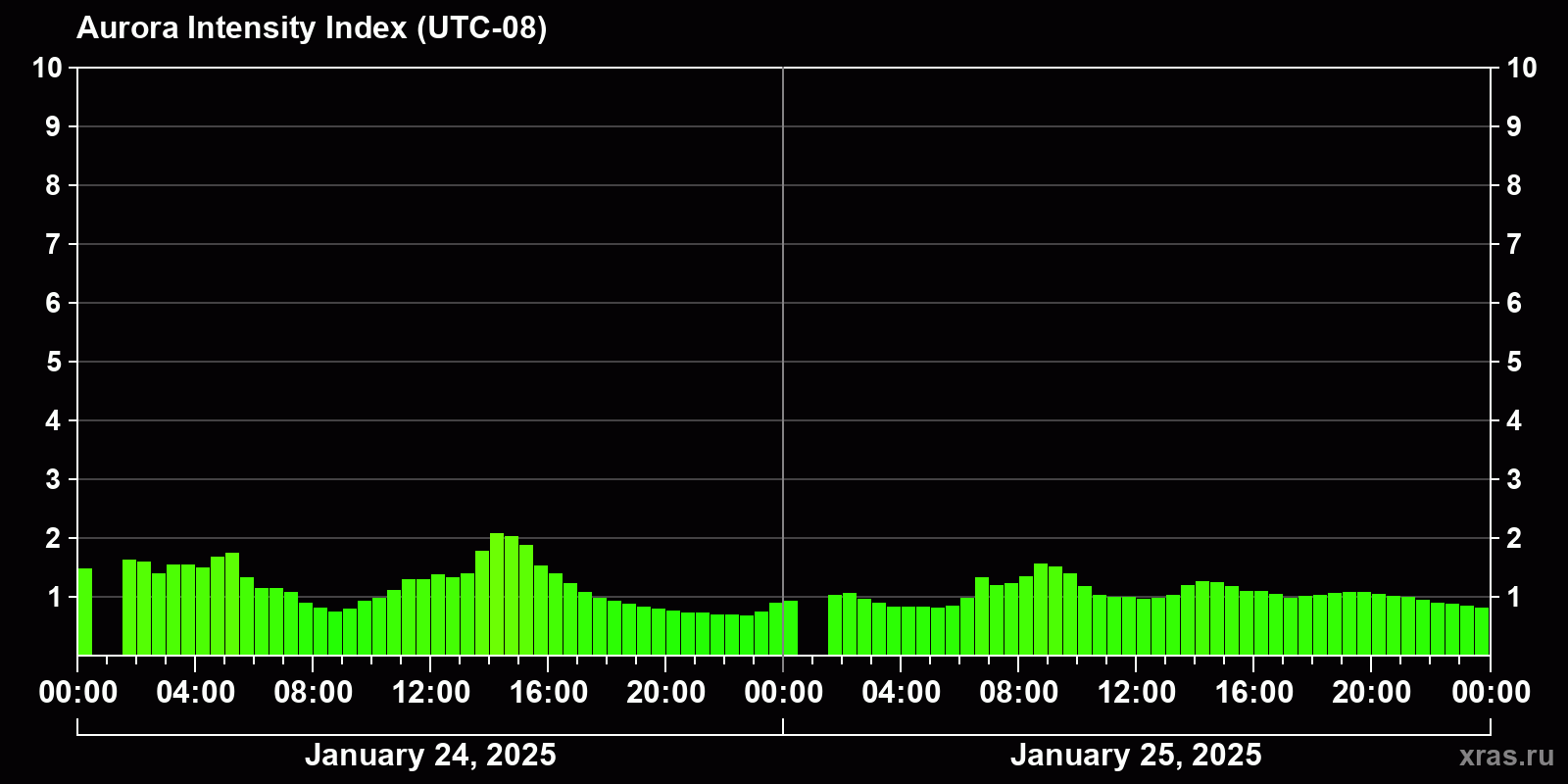 Auroral intensity index and the theoretically possible latitude of observations for nighttime in the Western Hemisphere as of 2025-01-25 23:58 (end of day) local time