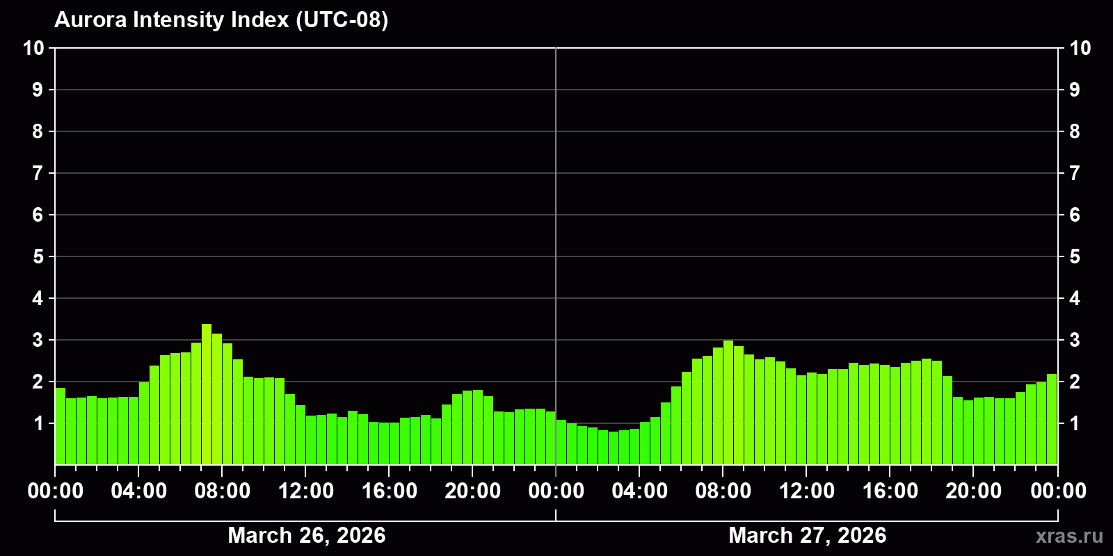 Changes in the auroral intensity index from 2026-03-26 to 2026-03-27 local time