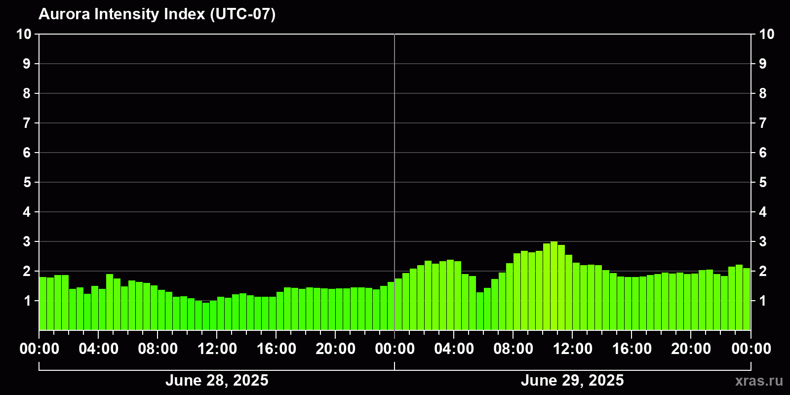 Changes in the auroral intensity index from 2025-06-28 to 2025-06-29 local time