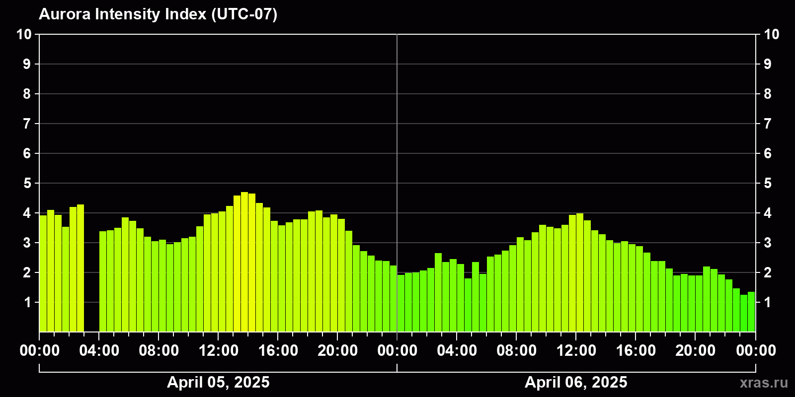 Auroral intensity index and the theoretically possible latitude of observations for nighttime in the Western Hemisphere as of 2025-04-06 23:48 (end of day) local time