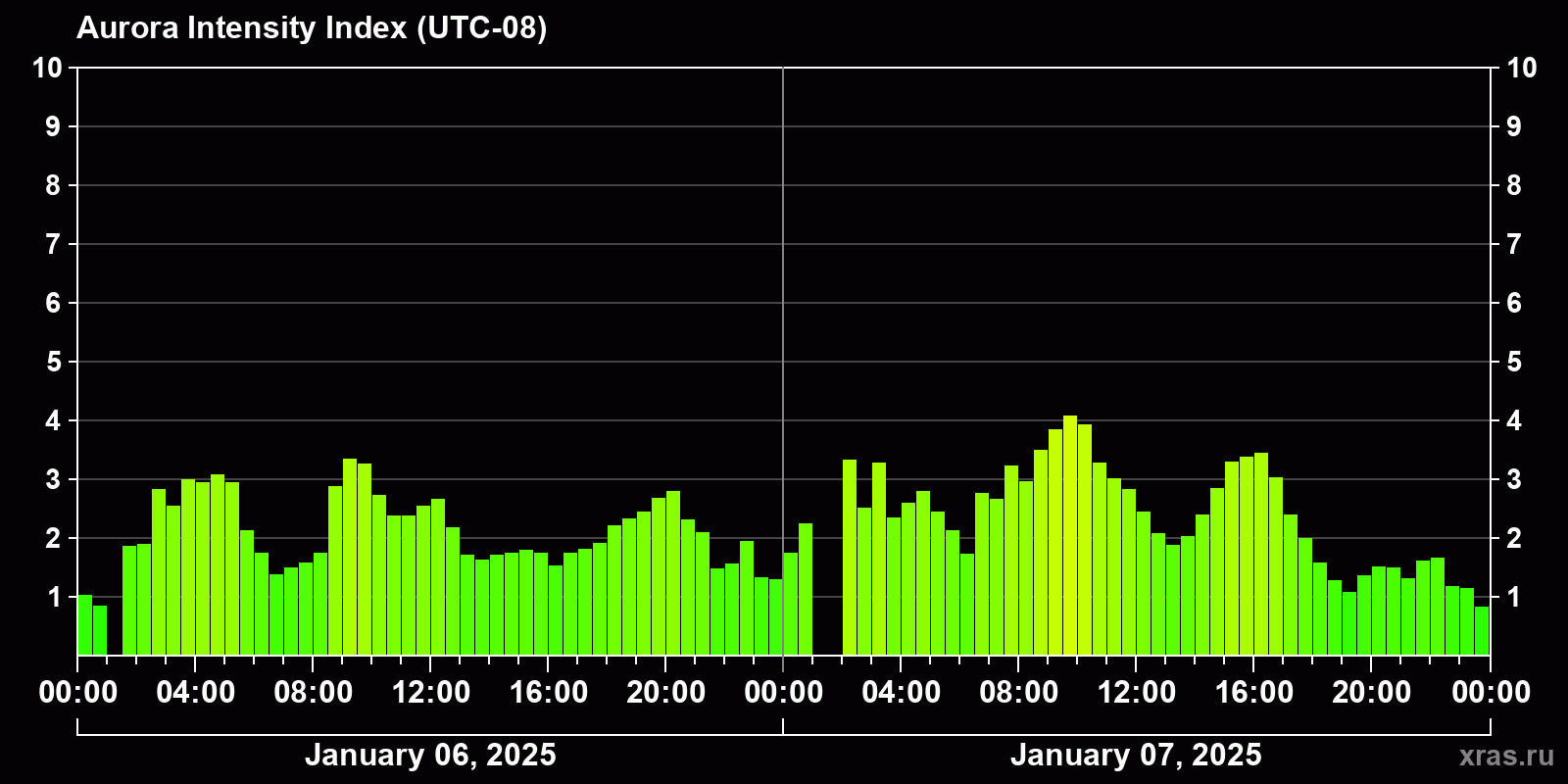Auroral intensity index and the theoretically possible latitude of observations for nighttime in the Western Hemisphere as of 2025-01-07 23:51 (end of day) local time