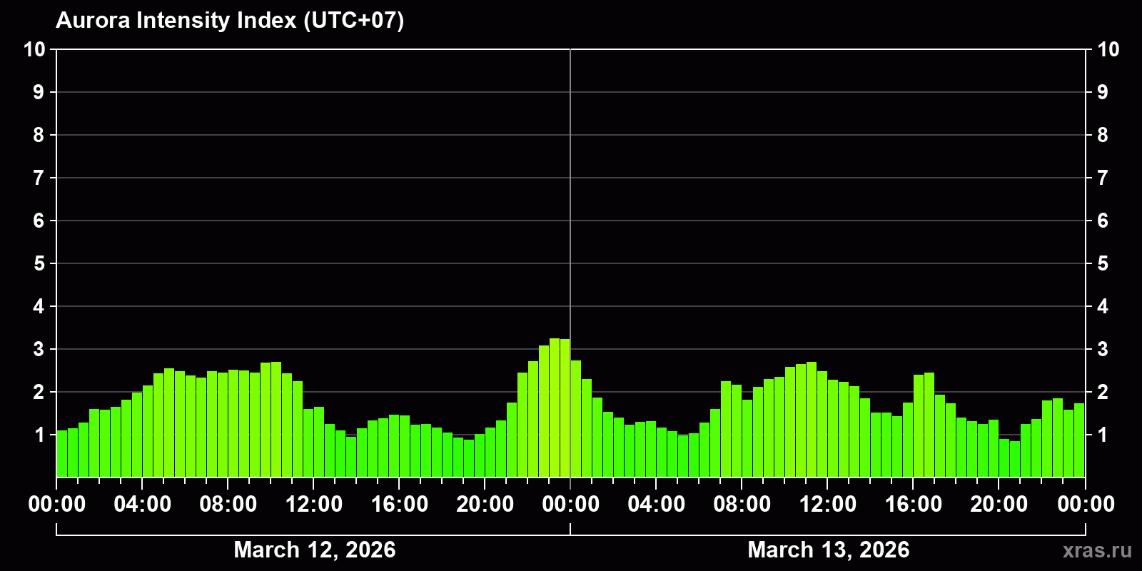 Changes in the auroral intensity index from 2026-03-12 to 2026-03-13 local time