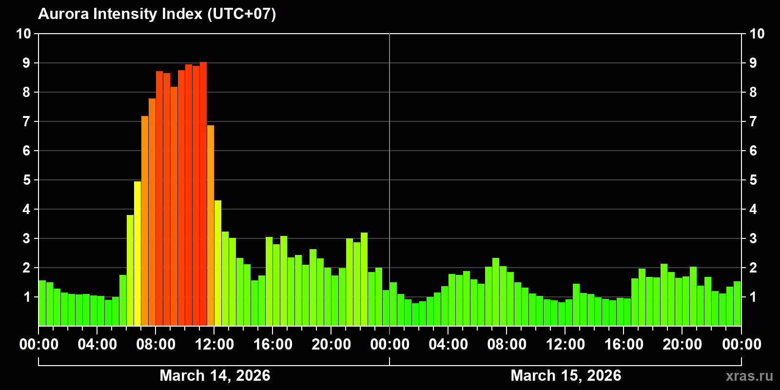 Changes in the auroral intensity index from 2026-03-14 to 2026-03-15 local time