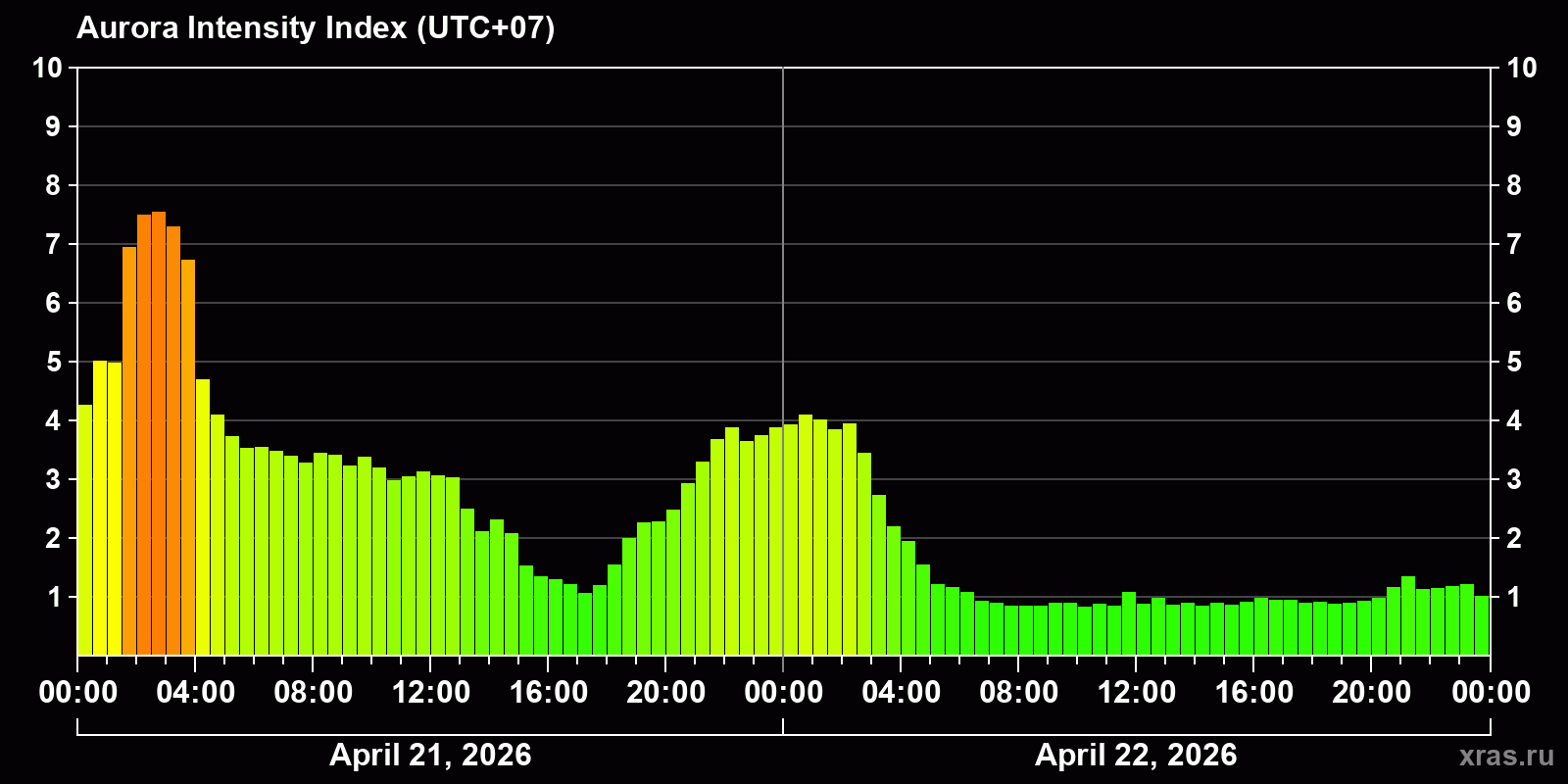 Changes in the auroral intensity index from 2026-04-21 to 2026-04-22 local time