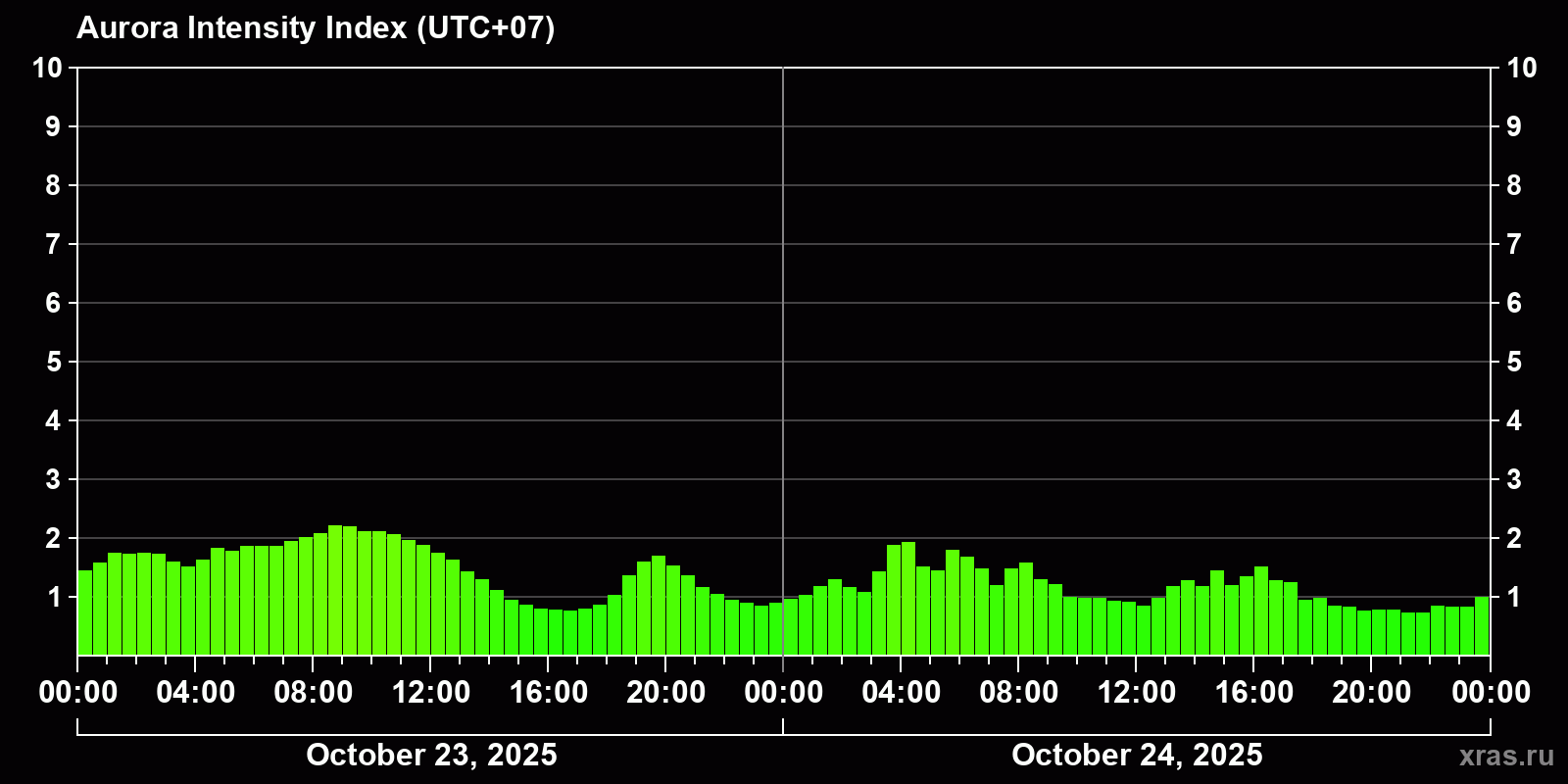 Auroral intensity index and the theoretically possible latitude of observations for nighttime in the Estern Hemisphere as of 2025-10-24 23:53 (end of day) local time