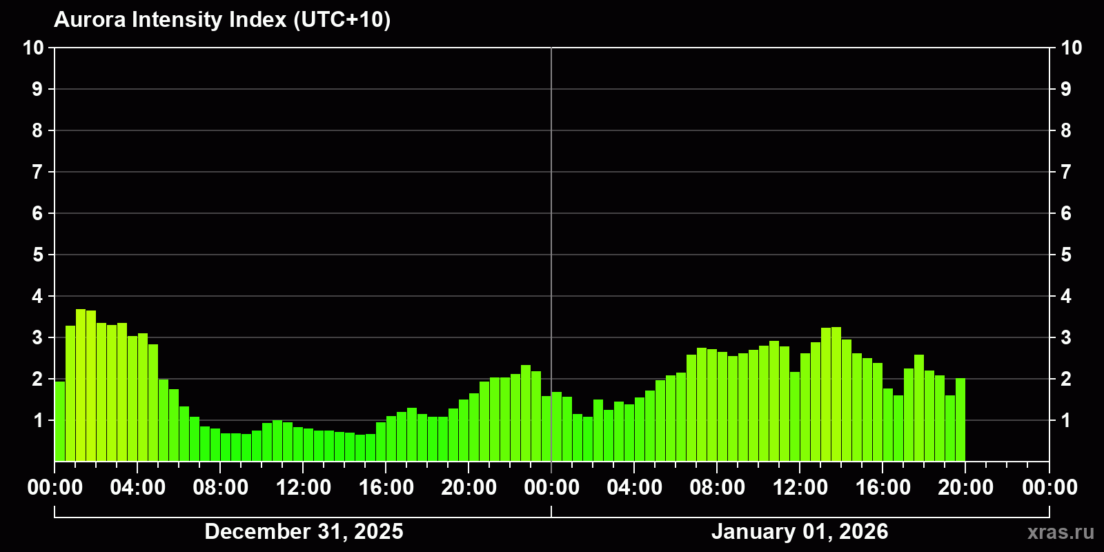 Auroral intensity index and the theoretically possible latitude of observations for nighttime in the Estern Hemisphere as of 2026-01-01 17:43 (end of day) local time