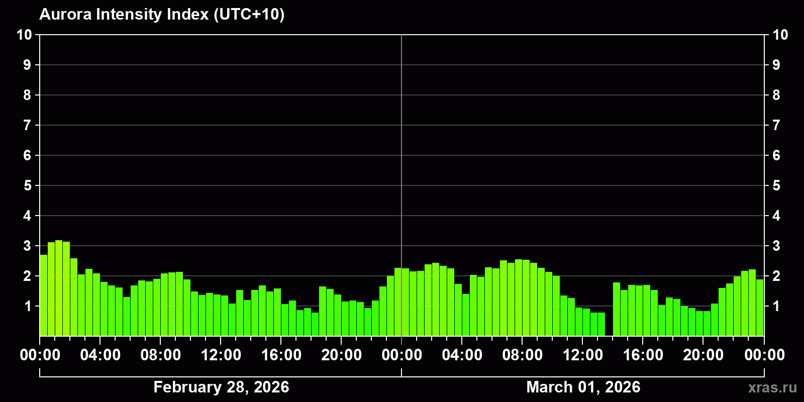 Auroral intensity index and the theoretically possible latitude of observations for nighttime in the Estern Hemisphere as of 2026-03-01 23:58 (end of day) local time
