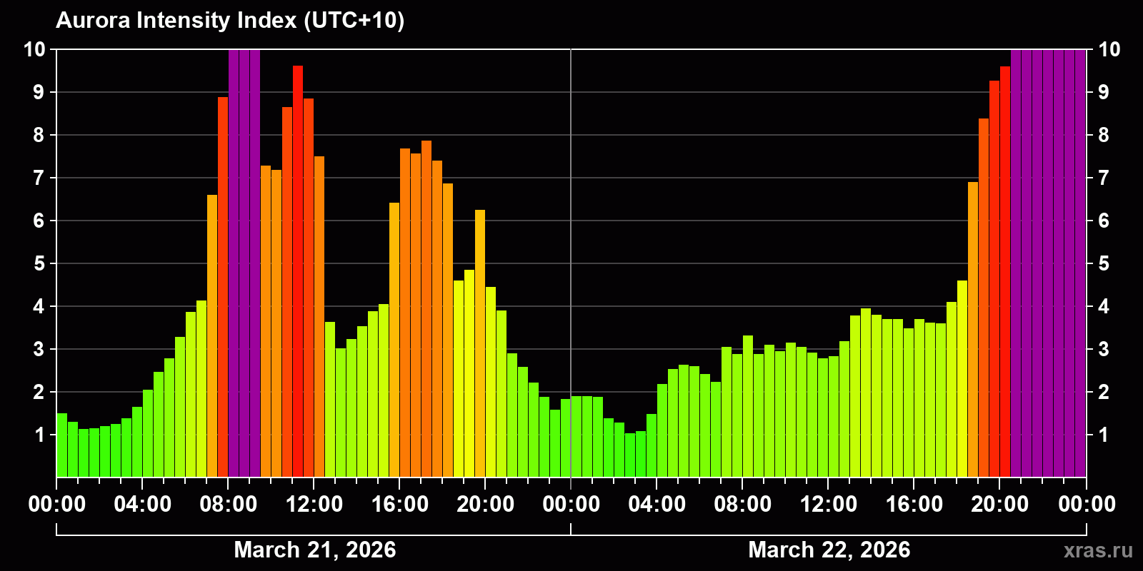 Changes in the auroral intensity index from 2026-03-21 to 2026-03-22 local time