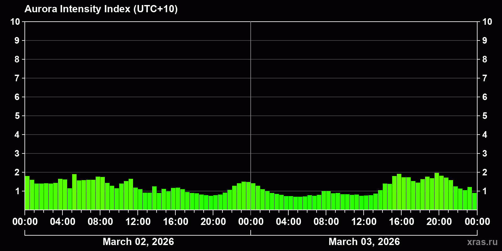 Changes in the auroral intensity index from 2026-03-02 to 2026-03-03 local time
