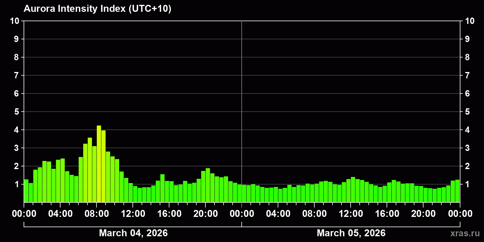 Changes in the auroral intensity index from 2026-03-04 to 2026-03-05 local time
