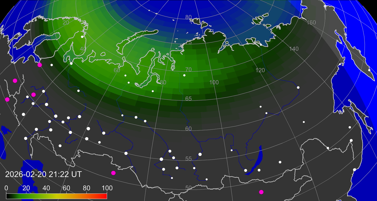 Изменения и часовой прогноз индекса интенсивности полярных сияний с 2026-02-19 по 2026-02-20