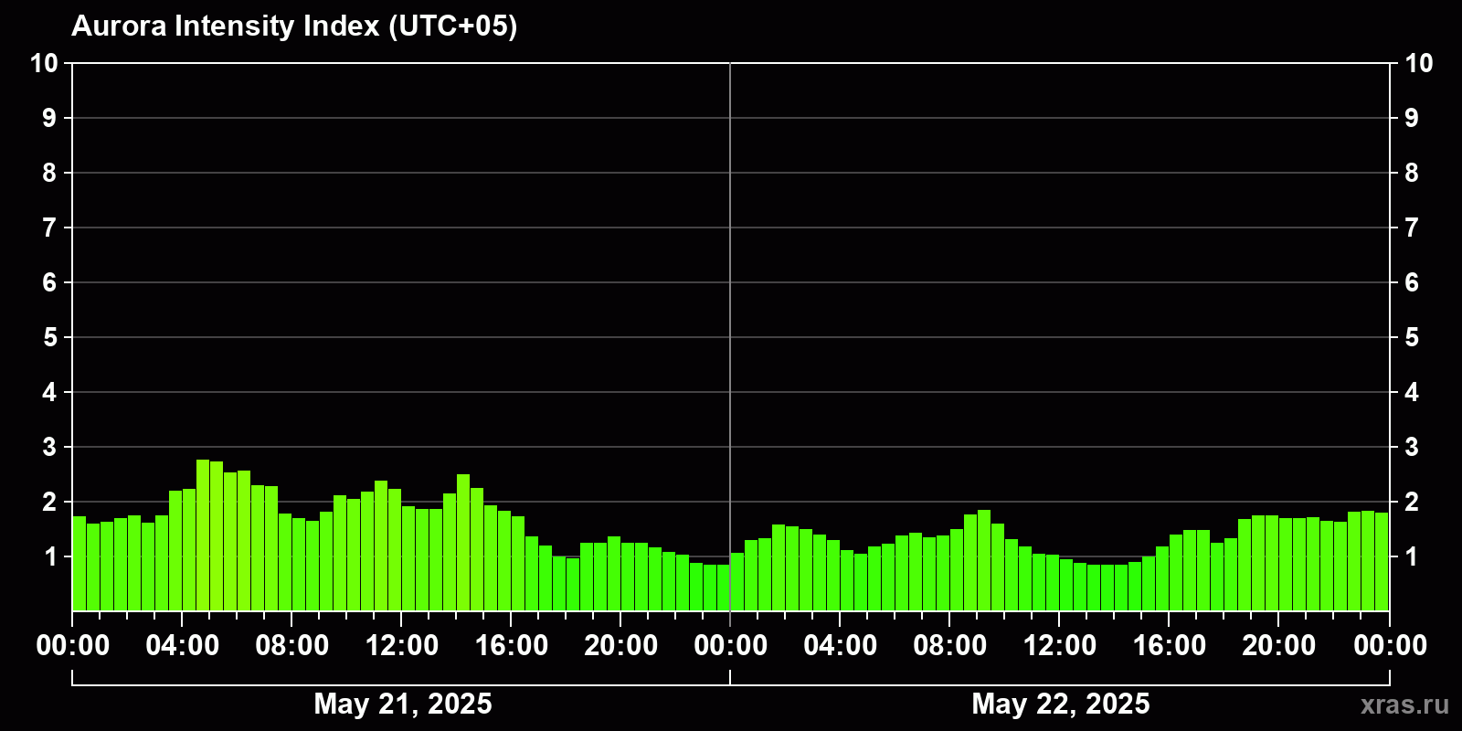 Auroral intensity index and the theoretically possible latitude of observations for nighttime in the Estern Hemisphere as of 2025-05-22 23:50 (end of day) local time
