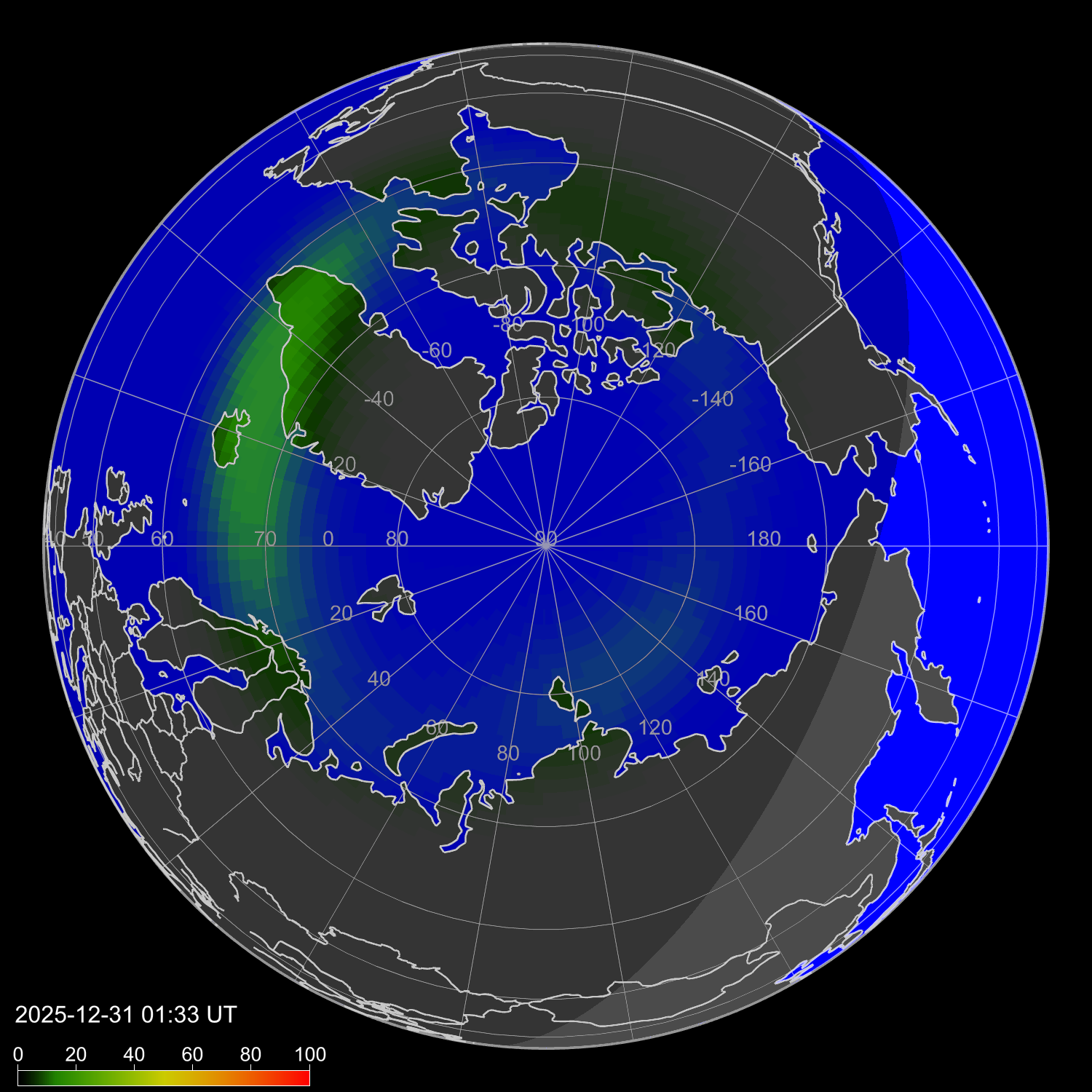 Индекс интенсивности полярных сияний и теоретически возможная широта наблюдений для ночного времени в западном полушарии