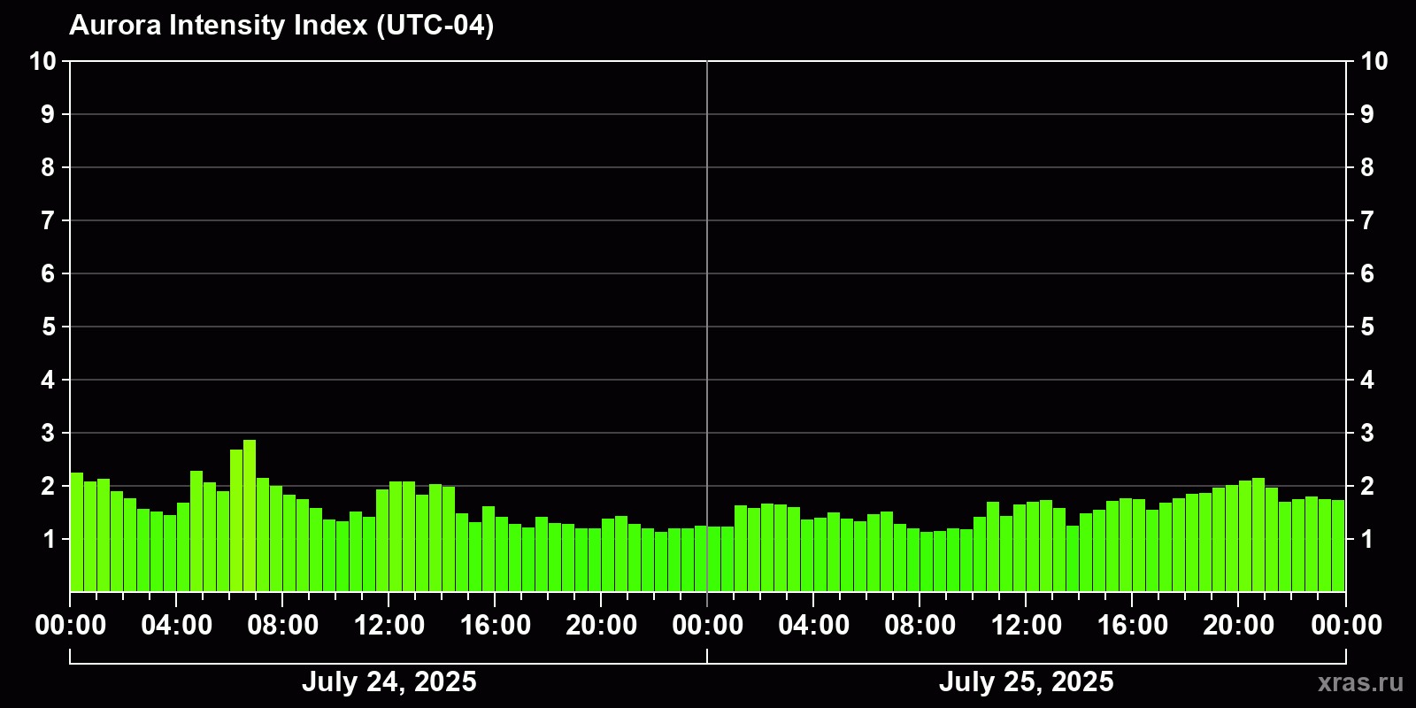 Auroral intensity index and the theoretically possible latitude of observations for nighttime in the Western Hemisphere as of 2025-07-25 23:45 (end of day) local time