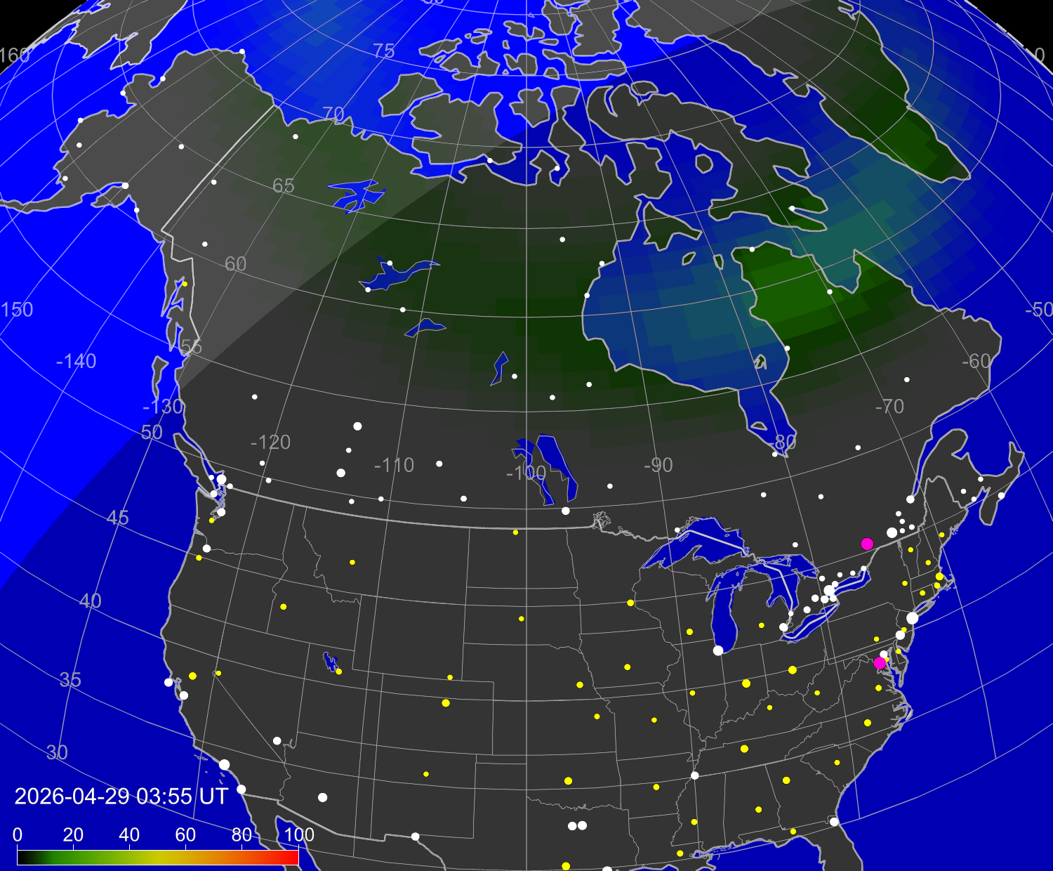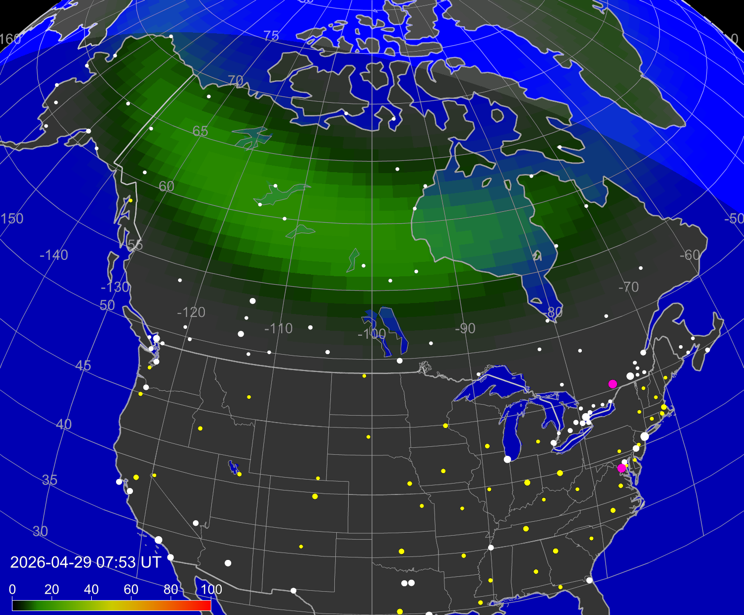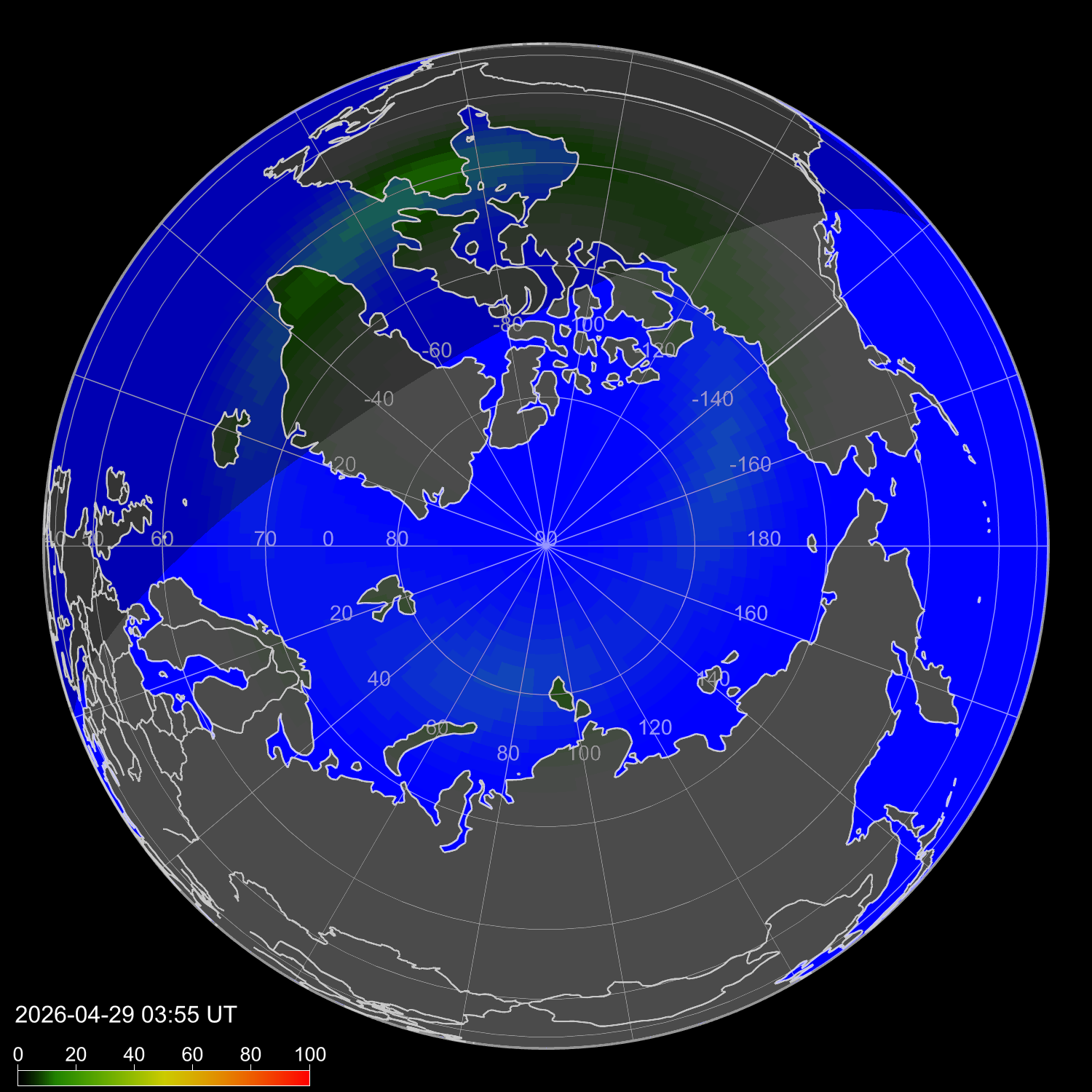Auroral intensity index and theoretically possible latitude of observations for nighttime in the Western Hemisphere