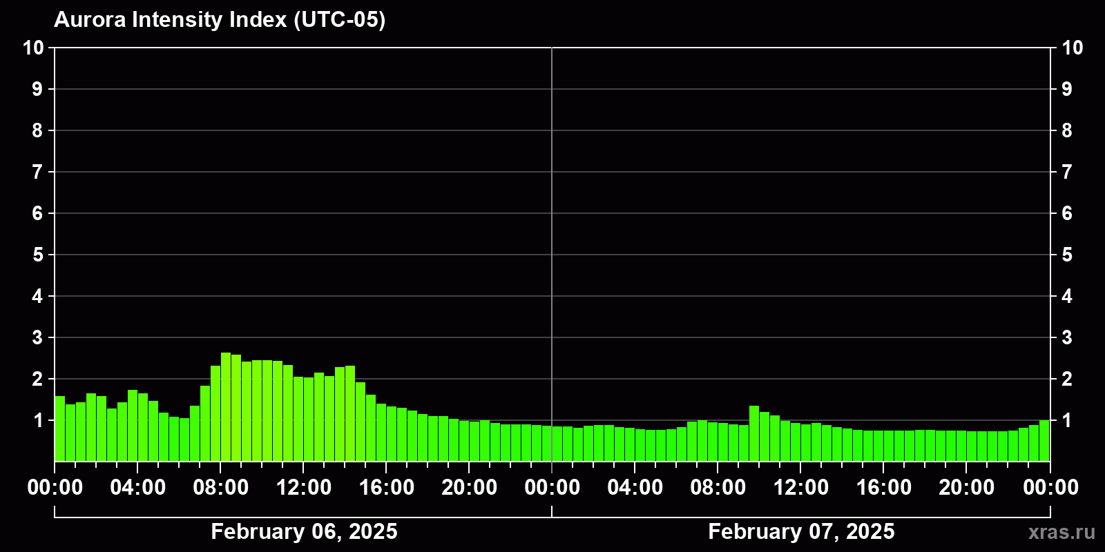 Auroral intensity index and the theoretically possible latitude of observations for nighttime in the Western Hemisphere as of 2025-02-07 23:47 (end of day) local time