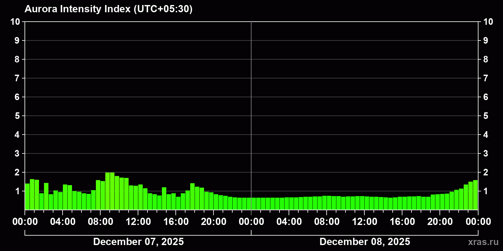 Auroral intensity index and the theoretically possible latitude of observations for nighttime in the Estern Hemisphere as of 2025-12-08 23:46 (end of day) local time
