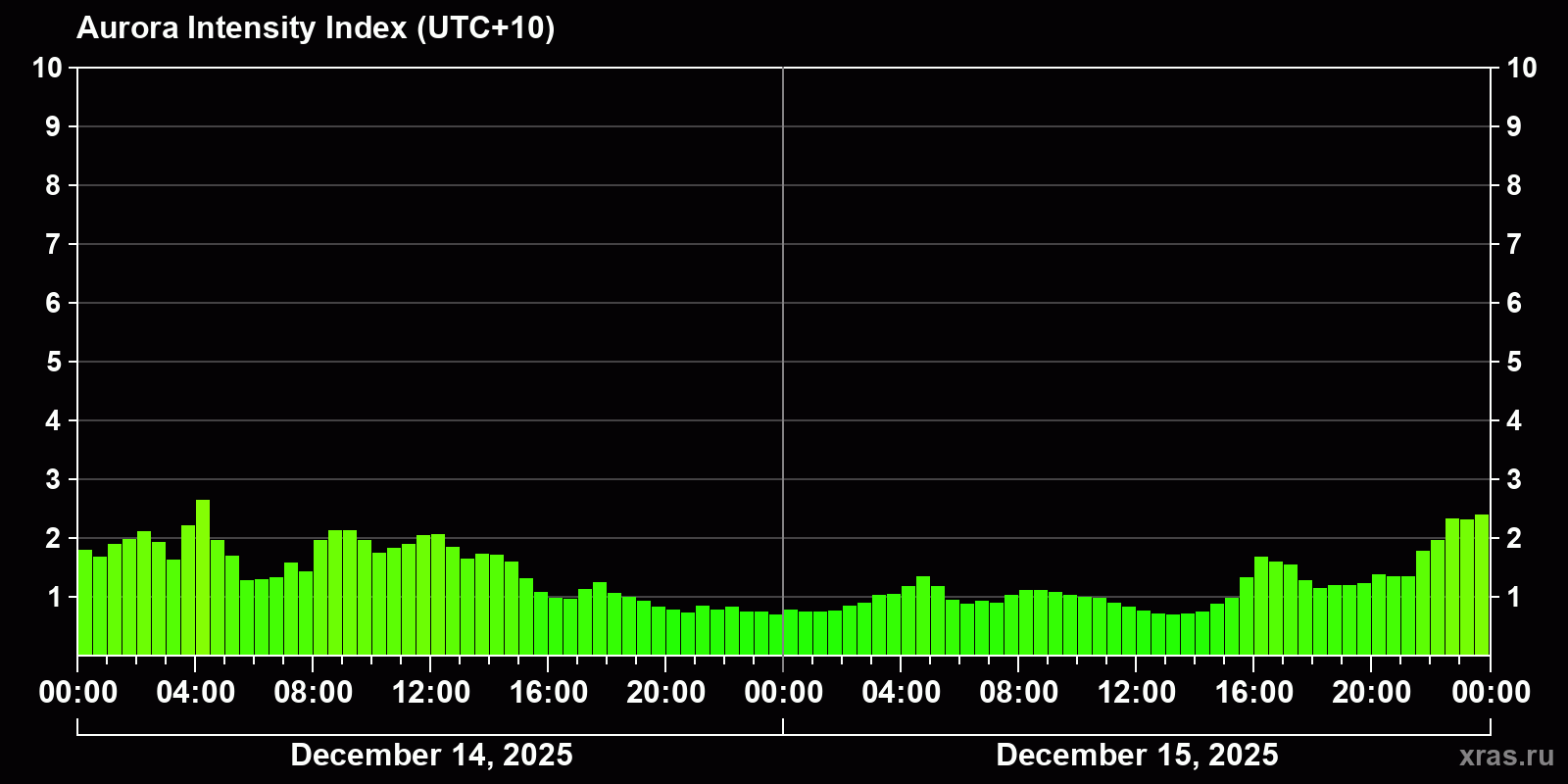 Changes in the auroral intensity index from 2025-12-14 to 2025-12-15 local time