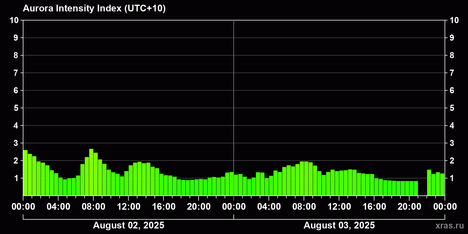 Changes in the auroral intensity index from 2025-08-02 to 2025-08-03 local time