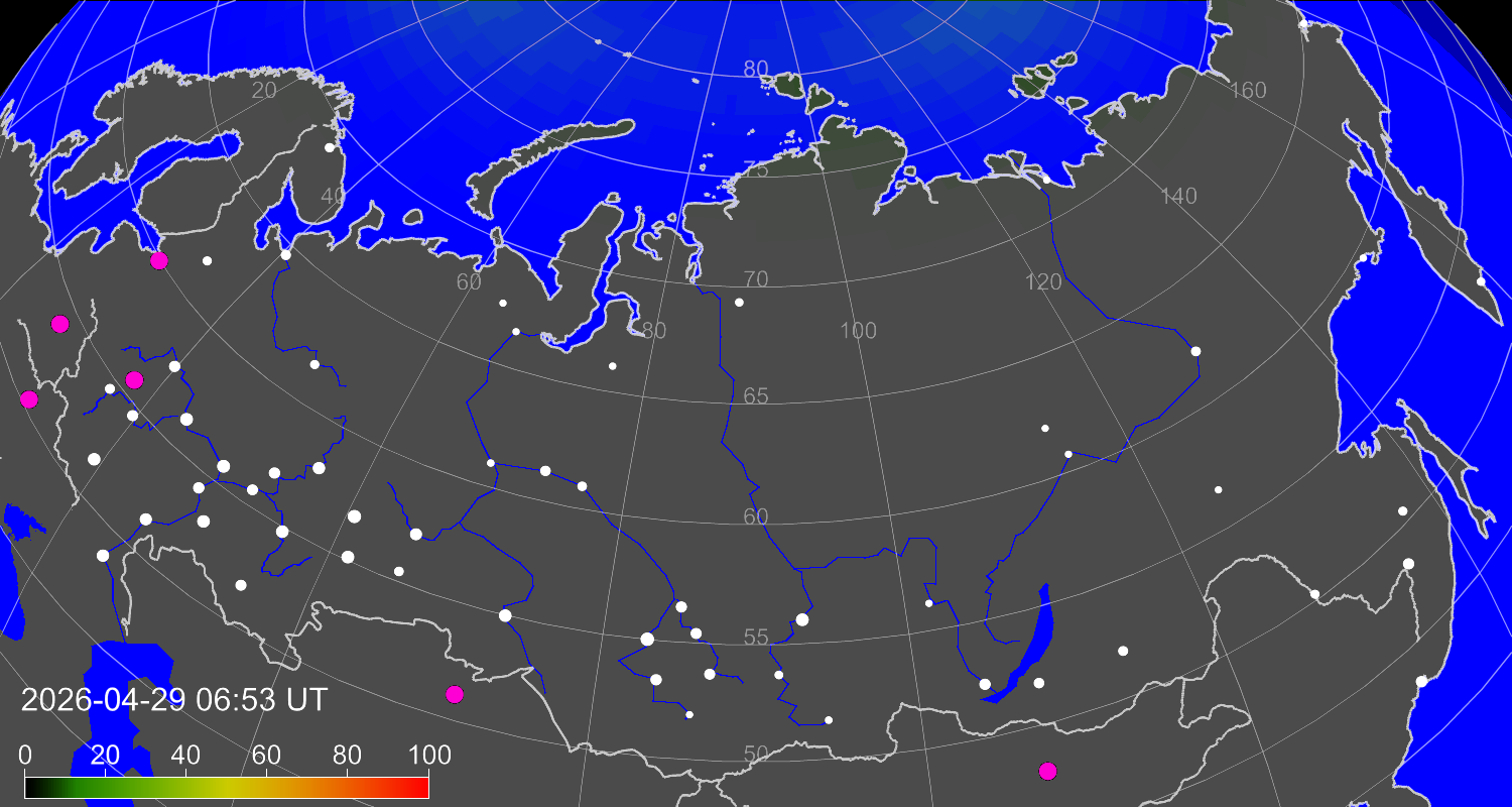 Probability of northern lights (auroras) in cities of Russia