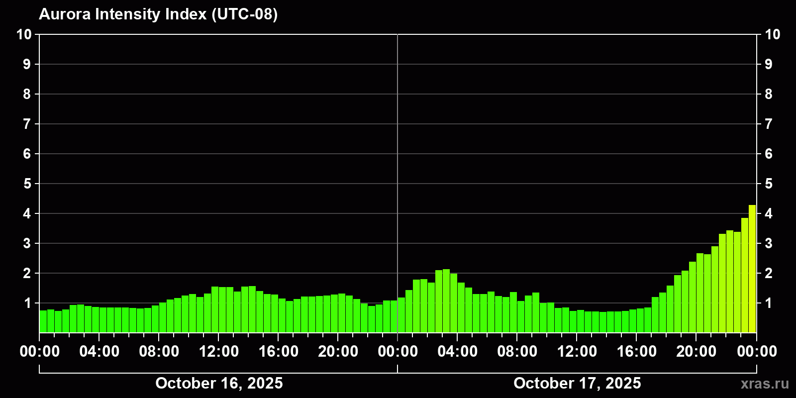 Changes in the auroral intensity index from 2025-10-16 to 2025-10-17 local time