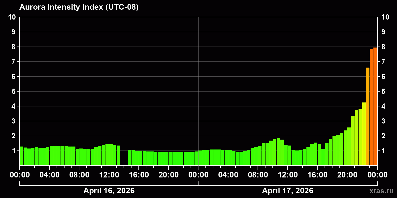 Changes in the auroral intensity index from 2026-04-16 to 2026-04-17 local time