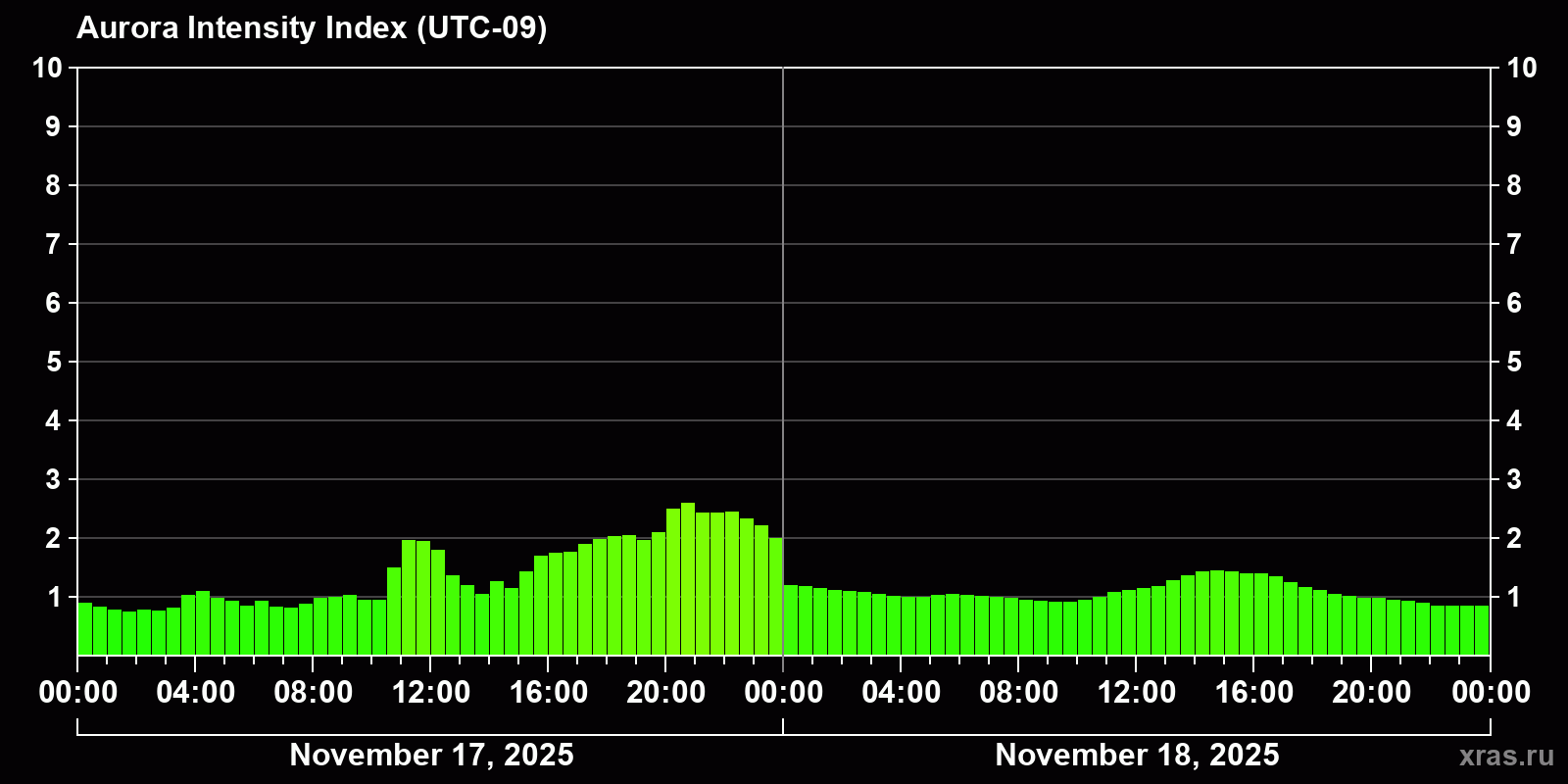 Changes in the auroral intensity index from 2025-11-17 to 2025-11-18 local time