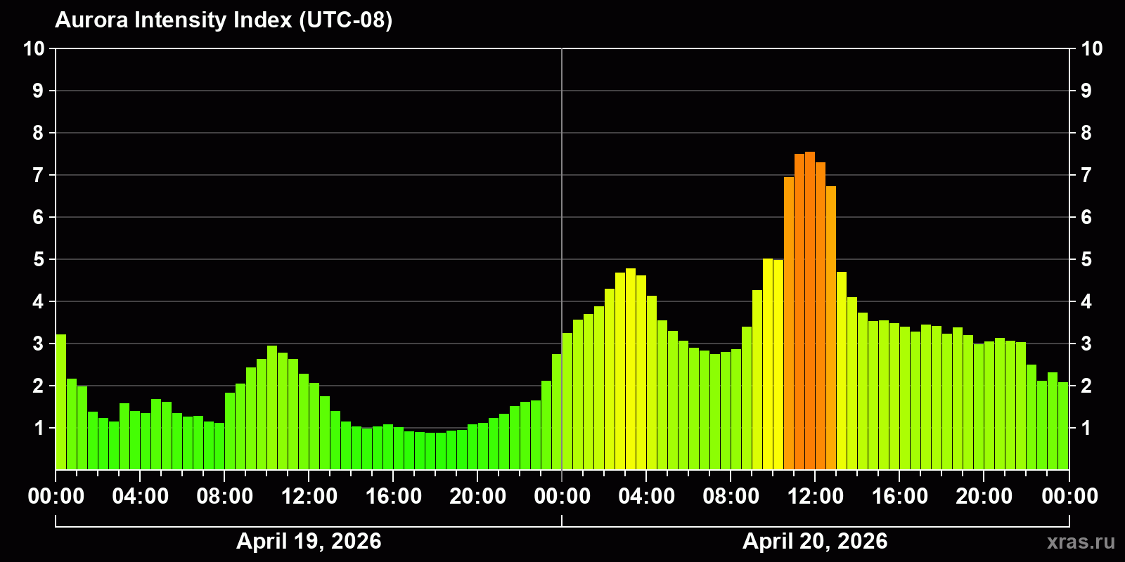 Changes in the auroral intensity index from 2026-04-19 to 2026-04-20 local time