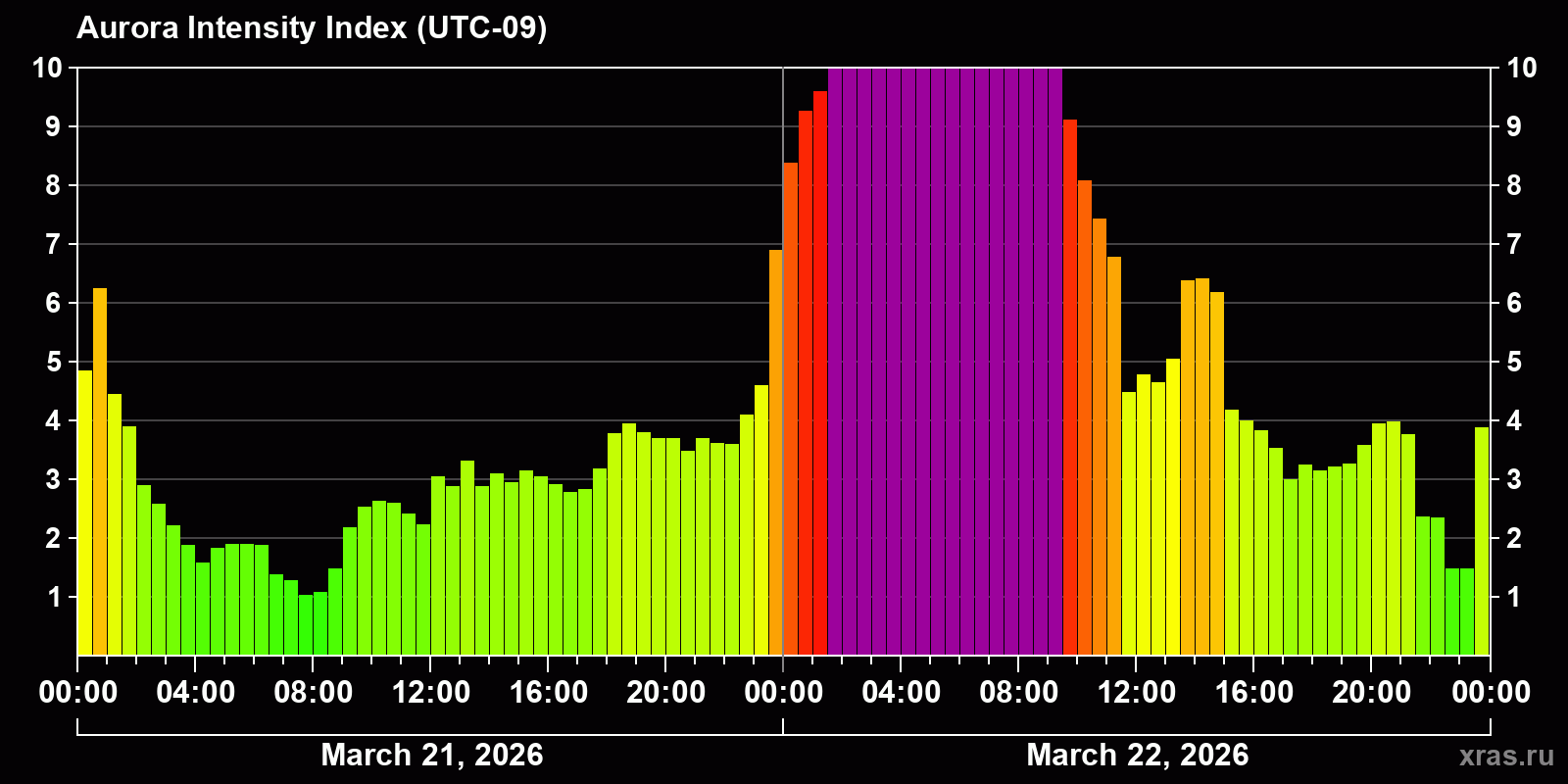 Changes in the auroral intensity index from 2026-03-21 to 2026-03-22 local time